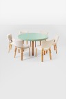 Ensemble composé d’une table modèle H94 et de six chaises modèle n°615 Bouleau, bois laqué et textile Édition Huonekalu- ja Rakunnustyötehdas Korhonen Modèles créés vers 1950 Table : H 71 ר 126cm Chaises : H 74×L 48ר 60cm