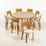 Alvar Aalto (1898-1976) Table et huit chaises Bouleau mélaminé, linoleum et tissu Edition Artek Date de création : vers 1930 Table : H 73 × Ø 127,5 cm Chaise : H 76,5 × L 39 × P 42 cm