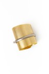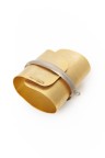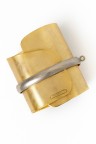 Bracelet manchette en feuille de laiton pliée ceinturée d'un anneau argenté Signé 9 x 10 cm Circonférence : 7,5 cm environ