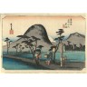 Ando Hiroshige (1797-1858) Oban yoko-e de la série "Tokaido gojusan tsugi no uchi", les cinquante-trois stations du Tokaido, station 26, "Nissaka", des voyageurs admirant une grosse pierre commémorative qui marque un endroit où a été commis un meurtre. Signé Hiroshige ga, cachet d'éditeur Takenouchi (Hoeido) 22,2 × 35 cm (Marges coupées, pliure médiane)