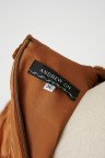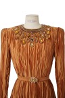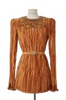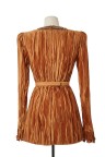 Robe couleur caramel, en satin de soie et plissée Vendue avec ceinture. Col ornementé T. 36 Etat NEUF