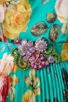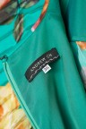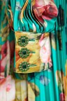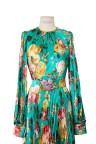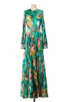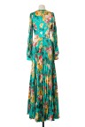 Robe longue verte à imprimé fleuri, jupon ceinture ornementée et amovible.
