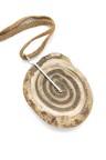 Collier en soie beige tressée, supportant en pendentif un motif ovale en jaspe agatéïforme, serti au centre d'une perle de nacre baroque. La monture en or gris 18k (750‰). Signé. Dimensions du motif : 8,8 x 6,7 cm Poids brut : 77 g