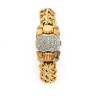 Montre bracelet de dame en or jaune 18k (750) et diamants. Boîtier fermeture à pression. Capot serti d'un pavage de diamants. Cadran patiné avec chiffres arabes et minuterie chemin de fer. Mouvement mécanique. Bracelet en or avec fermoir et chaîne de sûreté.