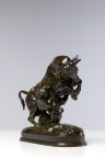 Taureau attaqué par un tigre Modèle créé vers 1841-1844 Bronze à patine brun vert Porte la marque du fondeur « F. BARBEDIENNE. Fondeur » H. 22 x terrasse L. 23 x P. 10,5 cm