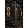 Armoire-cabinet en deux corps avec corps supérieur en retrait en bois noirci, pierres dures polychromes, bronze doré et fiets d’étain. Corps supérieur formant cabinet ouvrant à dix tiroirs et une porte centrale ; façades des tiroirs à caisson avec plaque en pietra dura à décor de branches fleuries et d’oiseaux ; partie centrale architecturée avec niche, colonnettes en marbre jaspé à chapiteaux corinthiens et fronton brisé ; entourage de la porte orné de diffrentes pierres dures enchâssées (lapis-lazuli, améthyste, rosso antico, jaspe strié, vert antique …) aux bords soulignés de fiets d’étain ; cette porte découvre deux tiroirs intérieurs avec façade en paesine, des tiroirs secrets se dissimulent dans les parois latérales ; ce corps est surmonté d’une galerie avec édicule central architecturé abritant une pendule et reprenant le même décor, agrémenté de statuettes et d’urnes en bronze doré. Corps inférieur ouvrant à trois tiroirs en ceinture et trois vantaux ornés de plaques de pierres dures enchâssées ainsi que les montants en pilastre ; il repose sur huit pieds tournés. Faces latérales également ornées de plaques de pierres dures. Prises des tiroirs et des portes en forme de petits bustes en bronze doré. Clefs. La pendule est dite pendule « queue de vache » au cadran argenté. Ancienne étiquette de la Maison Couto, restaurateur à Lisbonne. Italie, Florence, vers 1700 H 240 × L 150 × P 65 cm (petites restaurations)
