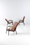 Ensemble de trois fauteuils inclinables Métal laqué, chêne et cuir Fabriqués par Les Ateliers Jean Prouvé Modèle créé vers 1935 H 100 × L 90 × P 64 cm