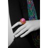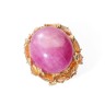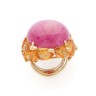 Bague "Boule" or jaune 18k (750‰) sertie d'un important cabochon de rubis étoilé dans un entourage de saphirs jaunes facettés de formes et de tailles variées