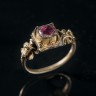 Bague en argent doré sertie d’un rubis. Chaton proéminent rectangulaire bordé d’arcatures ; épaules découpées portant un petit bouton. Poinçon. Dernier tiers du XVIe siècle H 2,4 × L 2,1 cm Poids : 2,9 g (petit manque à une épaule, légères usures de la dorure sur l’anneau)