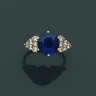 Bague en or jaune 18k (750‰) ornée d'un saphir rond à chatons à griffes épaulé de deux motifs triangulaires sertis de diamants taille brillant. Poids du saphir : 4,51 carats (probablement chauffé). Tdd : 59 Poids brut : 5,4 g