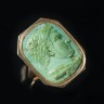 Bague en or sertie d’un camée en turquoise représentant le profi d’Hercule jeune tourné vers la droite. Poinçon à la tête de bélier. Camée : XVIIIe siècle Monture : département de la monnaie de Caen, 1781-1791 H 2 × L 1,5 cm Poids : 5,3 g Le lapidaire s’est vraisemblablement inspiré d’une intaille en cornaline signée du graveur grec Onesas représentant le même sujet. Un exemplaire faisait partie de la collection de pierres précieuses de l’abbé Andreini que Jean Gaston de Médicis acquit en 1731, un autre exemplaire est conservé également dans le cabinet des pierres gravées du roi des Pays-Bas. Le catalogue de cette collection en fait la description suivante sous le numéro 748 : « Tête laurée d’Hercule jeune, à droite ; portant une peau de lion autour du cou. Dans le champ ???S?S, nom du graveur grec Onesas. I. Cornaline. » Celle de l’abbé Andreini est reproduite dans l’ouvrage de Stosch sur les pierres antiques, publié en 1724, qui a servi de source iconographique dans les ateliers de graveurs sur pierre (fi.). Ouvrages consultés : P de Stosch, Gemmae antiquae caelatae... - Pierres antiques gravées sur lesquelles les graveurs ont mis leurs noms, dessinées et gravées en cuivre sur les originaux ou d’après les empreintes, Amsterdam, 1724 ; J.C. de Jonge, Catalogue d’empreintes du cabinet des pierres gravées de sa Majesté le Roi des Pays-Bas, Grand-Duc de Luxembourg, La Haye, 1837, p 41; G. Acidini Luchinat, Trésors des Médicis, Florence, 1997, pp 96-99.