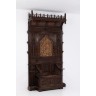 Banc-coffre à haut dossier en noyer teinté formant cathèdre. L'assise découvrant un coffre à décor d'arcatures ogivales ornée de blasons. Les accotoirs se terminant en grotesque, flanqués de repose-cannes latéraux. Le haut dossier à décor de tapiserie floral au petit point et sculpté d'arcatures et de plis serviettes. Le ciel en forme de corniche à décor ajouré de fleurs stylisés. Marque à l'encre : Meublant du château Malromé