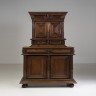 Belle armoire en noyer en deux corps avec corps supérieur en fort retrait ouvrant à quatre vantaux et quatre tiroirs. Vantaux à panneaux ressortis, montants à colonnes cannelées, un à colonne lisse, avec bases à décor de rameaux de lierre ou d'appareillage de pierre, frise ornée de têtes d’angelot dans la partie supérieure, corniche inférieure en scotie, pieds en boules aplaties. Lyonnais, début du xVIIe siècle H 186 x L 125 x P 60 cm
