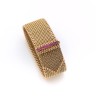 Bracelet ceinture en tissu d'or jaune 18k (750‰), le fermoir en forme de barrette est rehaussé de 7 pierres roses et retient une frange de 13 petites chaînettes terminées par des boules d'or