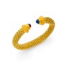 Bracelet jonc ouvert en tissu d'or jaune 18k (750‰) sur ressort d'acier, chaque extrémité en forme de fleur de lotus est centrée d'un cabochon de verre Diamètre intérieur : 5,3 cm environ (flexible) Poids brut : 44 g