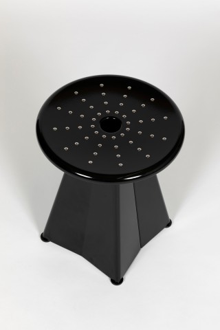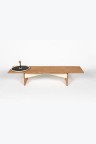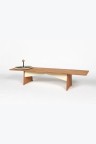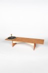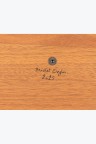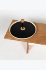 Plan et pieds en contreplaqué teintés amande, poignée du plateau en tilleul, gainé de cuir noir.