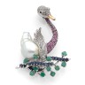 Broche "Cygne" en argent et or gris 14k (585‰) le corps formé par une soufflure de perle, le cou est rehaussé de rubis (manque un), la tête et les ailes de diamants ronds, deux rubis pour les yeux. Il se repose sur des feuillages sertis de saphirs et d'émeraudes ronds.