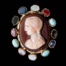 Broche de forme ovale avec camée en cornaline à décor d'un profi gauche féminin à l'antique dans une monture en or à douze cabochons ovales sertissant diffrentes pierres (turquoises, opales, cornalines, jaspe sanguin, onyx, quartz œil de faucon, saphir ?). XVIIe siècle H 4,7 cm (petit éclat à une pierre)