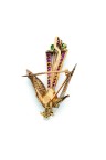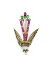 Broche/pendentif "Oiseau" en or jaune 18k (750‰) orné de diamants taillés en rose, de rubis, d'émeraudes et de perles probablement fines dont une en pampille