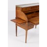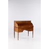 Bureau à cylindre en acajou et placage d'acajou toutes faces, l'abattant dévoilant six tiroirs sur deux espaces de rangement, trois tiroirs en partie haute et quatre tiroirs en ceinture. Deux tirettes latérales. Il repose sur quatre pieds fuselés et cannelés avec bagues en bronze doré. Dessus de marbre blanc et galerie ajourée