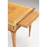 Bureau plat en bois de rose, la ceinture ouvrant à trois tiroirs et deux tirettes, reposant sur des pieds en gaine à décor de disques et draperies de bronze doré.