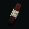 CARTIER, modèle Tank. Montre bracelet d'homme, la montre de forme rectangulaire en or jaune 750°/oo, cadran émaillé crème, chiffres arabes pour les heures, chemin de fer pour les minutes. Le tour de poignet en cuir brun, le fermoir boucle à ardillon en or jaune 750°/oo, signée. Mouvement à quartz. Signée sur le cadran et le fond, numérotée 8810529110. Poids brut : 30 g Dans son écrin. Provenance : Succ. de Mr J H. vente au profit de l'ICM. Institut du cerveau et de la moelle épinière.