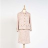 CHANEL. Tailleur jupe en lainage rose et blanc moucheté vert.
