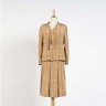 CHANEL. Tailleur jupe à plis plats en soie beige et verte.
