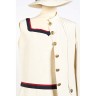 CHANEL. Ensemble robe et veste en gros grains beige, ceinture et col bleu marine et rouge. On joint son chapeau assorti.