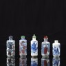 Ensemble de cinq flacons tabatières de forme tronconique en porcelaine bleu, blanc et rouge à décor de scènes des trois royaumes et d'objets mobiliers. Deux marques Yongzheng apocryphes.