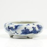 Brûle-parfum tripode en porcelaine décorée en bleu sous couverte de deux immortels et un serviteur dans un paysage lacustre.