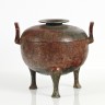 CHINE - Royaumes Combattants (480-221 av. JC.) Vase tripode de forme de "dou" en bronze à patine rouge à décor incisé de frises de spirales et frise de cigales stylisées. H.22 cm (Restaurations)