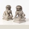 CHINE - XXe siècle Couple de chimères en grès à traces de polychromie, assise sur une haute base rectangulaire, la femelle avec sa patte sur son petit, le mâle sa patte sur la boule de pouvoir. (Petites restaurations) h 25 et 26 cm