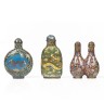 CHINE - XXe siècle Ensemble comprenant trois flacons tabatières en émaux cloisonnés polychrome, dont un ouble flacon à décor de fleurs, un flacon à décor de dragons dans les nuages, l'autre d'éventail et ragons. Bouchons en émail cloisonné. H.de 5,3 à 6,4 cm