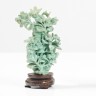 Petit vase en turquoise à décor sculpté en relief de pivoines et oiseaux.