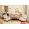 Sofa de tapicería, dos sillones, mesa de centro y lámpara de pie