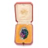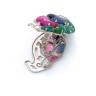Magnifique clip de corsage "Tutti Frutti" en platine (850‰) serti de rubis, saphirs et émeraudes gravés et rehaussé de diamants ronds et baguette