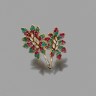 Broche "Dahlias" en or jaune 18k (750‰) rubané orné de rubis et d'émeraudes ronds et de diamants navette, les tiges serties de diamants baguette.