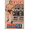 Catch, Harry Pinetzki contre Primo Carnera, Boulogne-sur-Mer, 1958 Edition de Hartfort, Paris Affiche offet entoilée 124,5 × 84,7 cm “A la fin de sa carrière de boxeur poids lourds (1,97 m pour 122 kg), ruiné par son manager, décida de devenir catcheur.”