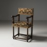 Chaise à bras en noyer. Pieds antérieurs tournés en colonnes baguées avec traverse d'entretoise moulurée en façade ; supports d'accotoirs en console ornés de pennes ; accotoirs légèrement incurvés se terminant en crosse gravée d'une volute. Fin du XVIe siècle H 109 × L 59 × P 49,7 cm Recouverte d’une tapisserie au petit point (une travers d'entretoise refaite, pieds arrière entés)