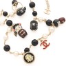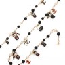 SAUTOIR en métal doré, perles d'imitation noires et blanches, breloques figurant des sigles émaillés, des poupées russes façons geisha, des lampions, une théière et un bol de riz, sigle sur fermoir