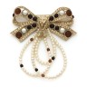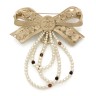 BROCHE noeud à pampilles en métal doré strassée, cabochons en verre et perles d'imitation, motif central figurant un lion retenant un petit anneau siglé