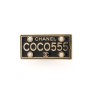 CHANEL PIN'S signé et siglé en métal doré emaillé noir figurant l'inscription "Coco 555", demi-perles d'imitation Env. 3,7 x 2 cm Micro rayures sur métal doré
