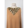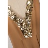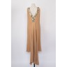 ROBE en crêpe de soie cappuccino, plastron et décolleté au dos rebrodés de paillettes, sequins et petites perles dorés et argentés, effet de pan flottant depuis le creux des reins revenant sur une épaule