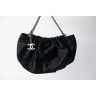 CHANEL SAC en satin noir matelassé, garnitures en métal chromé retenant une breloque siglée Hologramme Env. 26 x 15 cm Quelques mini marques sur satin et rayures sur métal