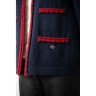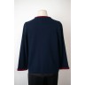 CHANEL VESTE en tricot cachemire marine rehaussée de galons en jacquard rouge, plaque siglée en métal argenté émaillé, quatre poches plaquées T. 36