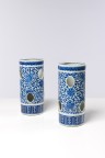 Paire de porte-perruque en porcelaine à décor en bleu sous couverte de lotus et symboles de bon augure dans des rinceaux feuillagés, le col à décor d'une frise de ruyi et le pied de panneaux de lotus. (ébréchures)