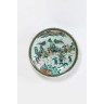 Grand plat en porcelaine émaillée polychrome dans le style de la famille verte à décor d'une scène du roman des trois royaumes, guerriers à cheval dans les montagnes. Au revers, quatre branches de pivoines et la marque apocryphe de Yongzheng sur fond turquoise. Diam. 46 cm