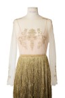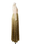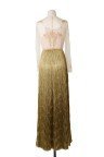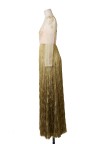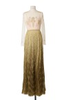 Robe du soir en soie Plastron en tulle brodé de fils d'or, manches longues Long jupon composé de multiples rangs frangés bronze T. 38 Excellent état