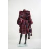 MANTEAU juponné en velours imprimé chatoyant dans les tons rose, vert, bleu et brun à décor floral stylisé, demi-manches bouffantes, taille drapée, boutons pressions, effet de col légèrement drapé. ÉTOLE drapée à pompons
